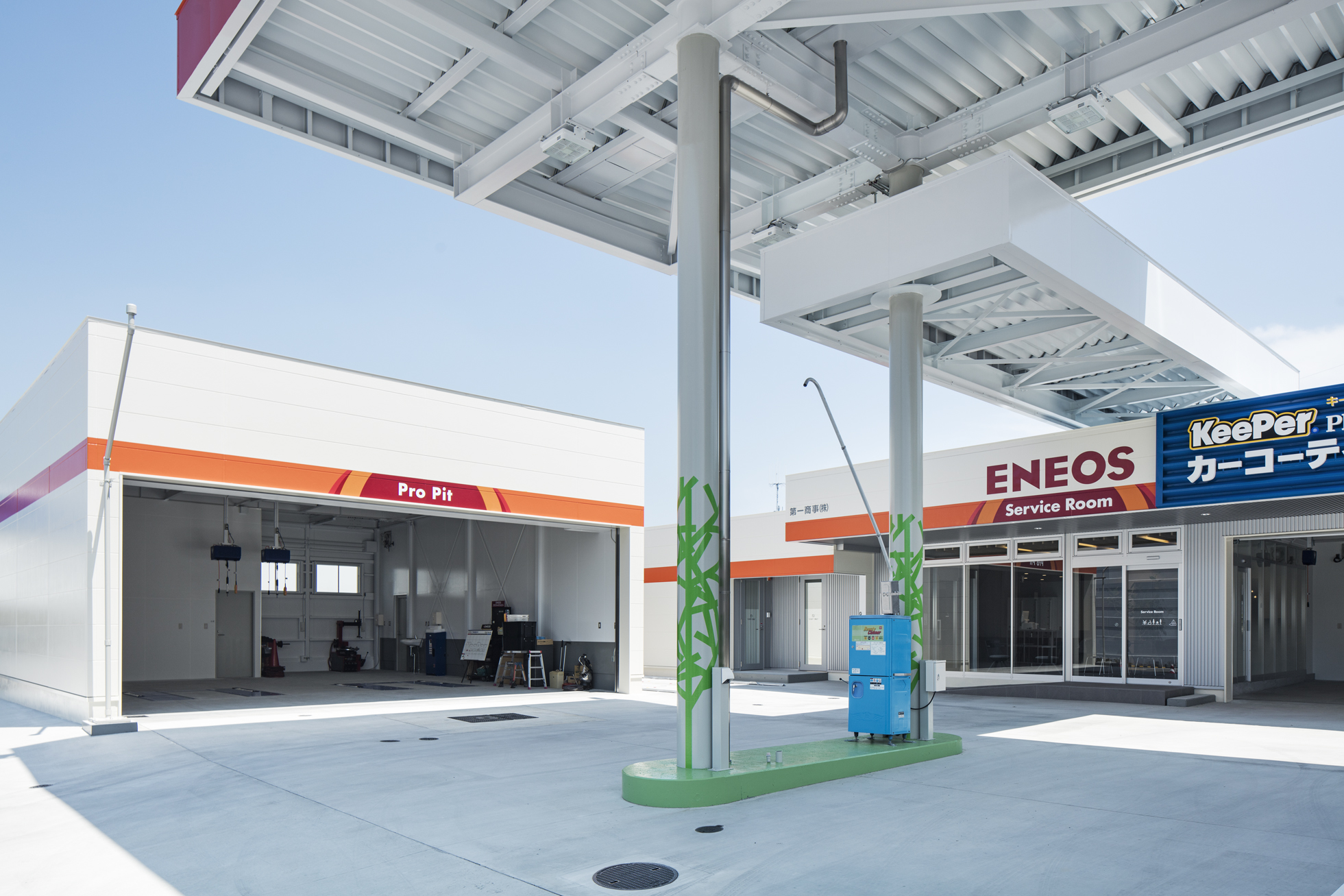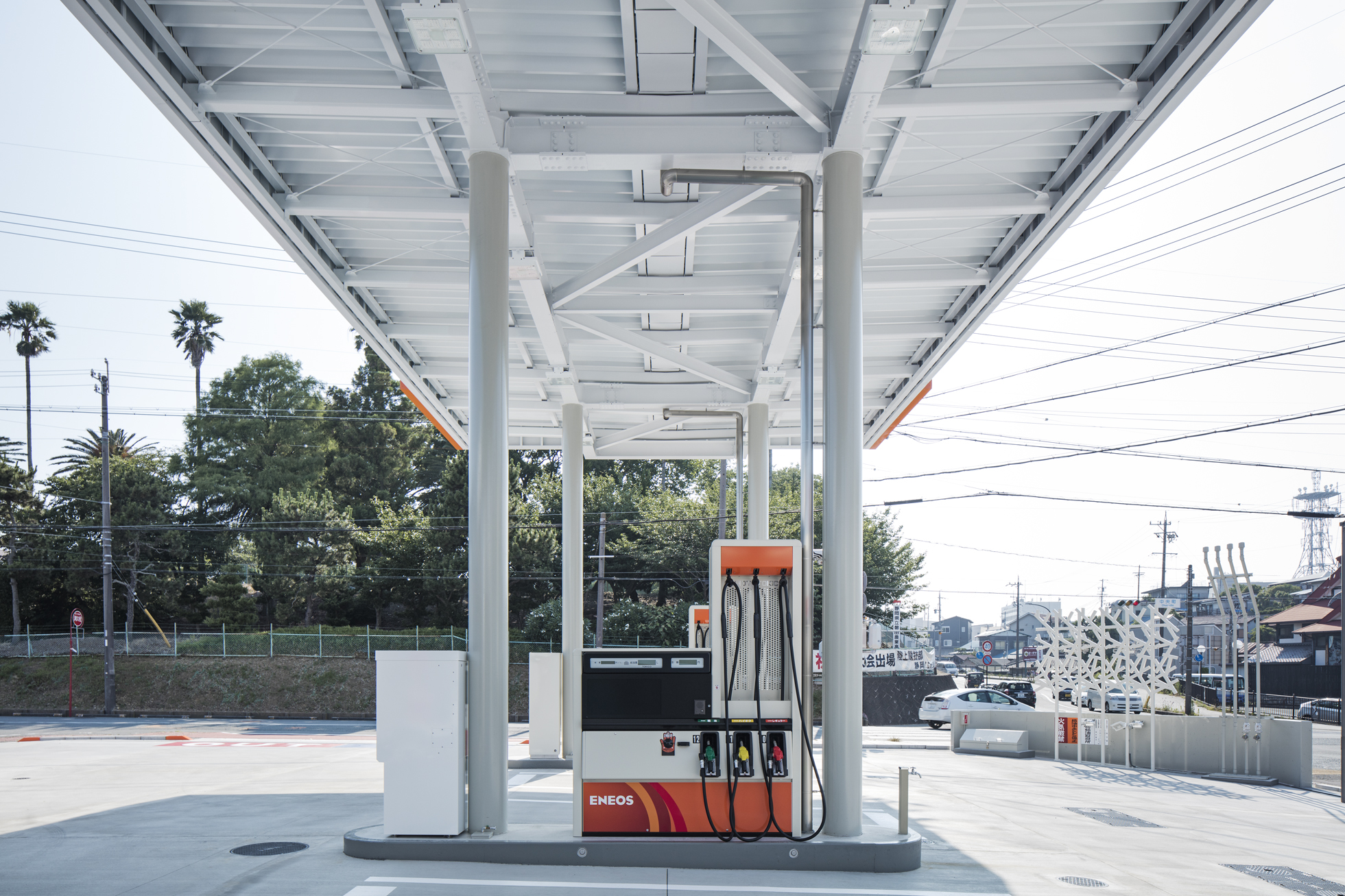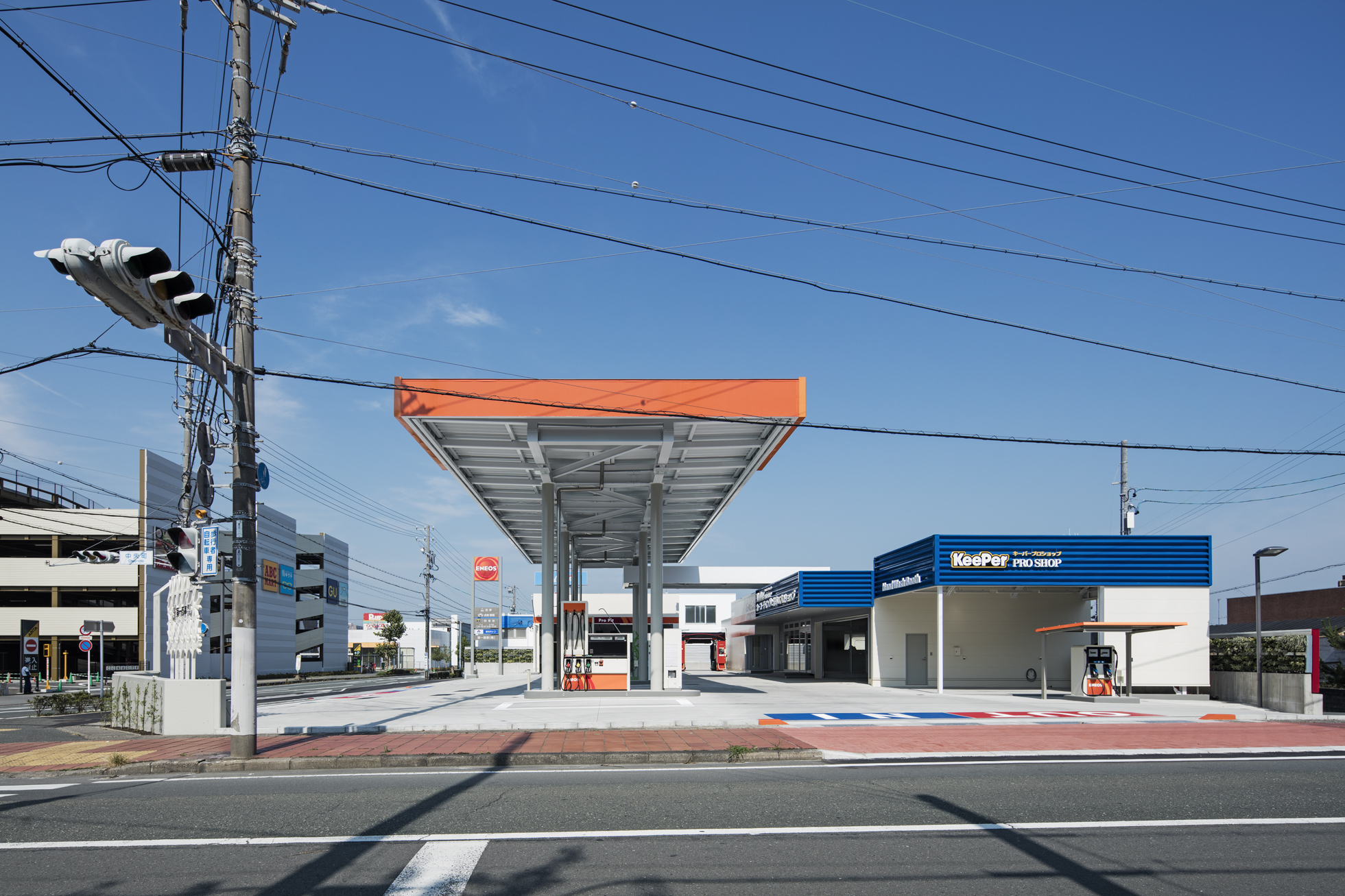 ENEOS 中央町SS 改修 所在地静岡県磐田市 発注者第一商事株式会社 業務内容基本設計・実施設計・工事監理 用途給油取扱所 竣工年月2017.06 構造形式鉄骨造 規模平屋建て 延床面積568.79㎡ 撮影長谷川健太 担当増田航平