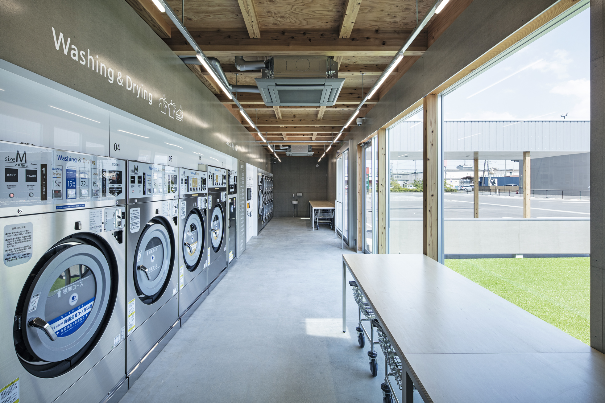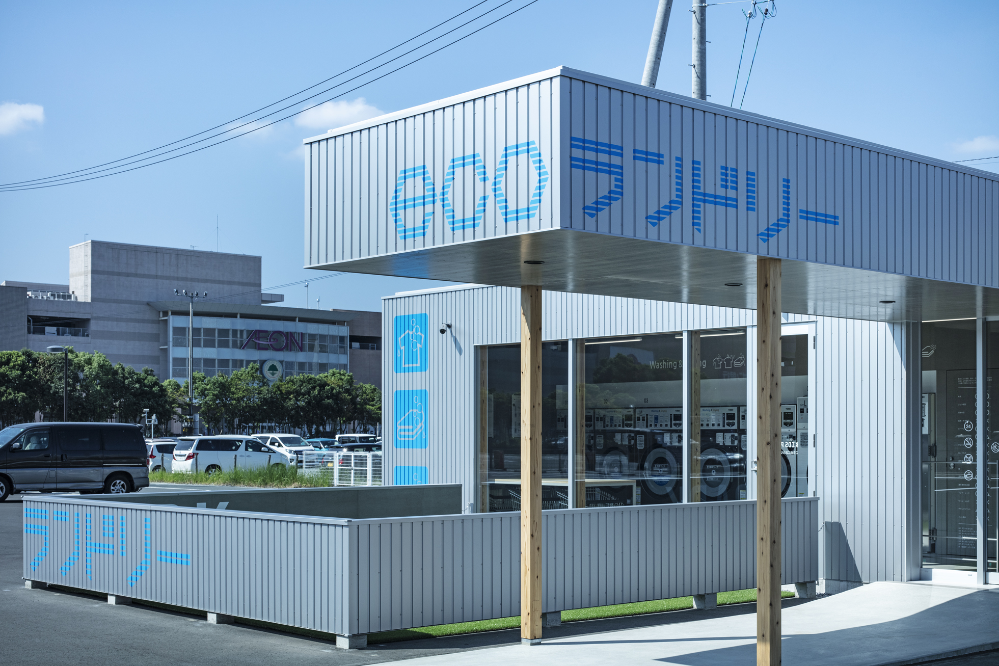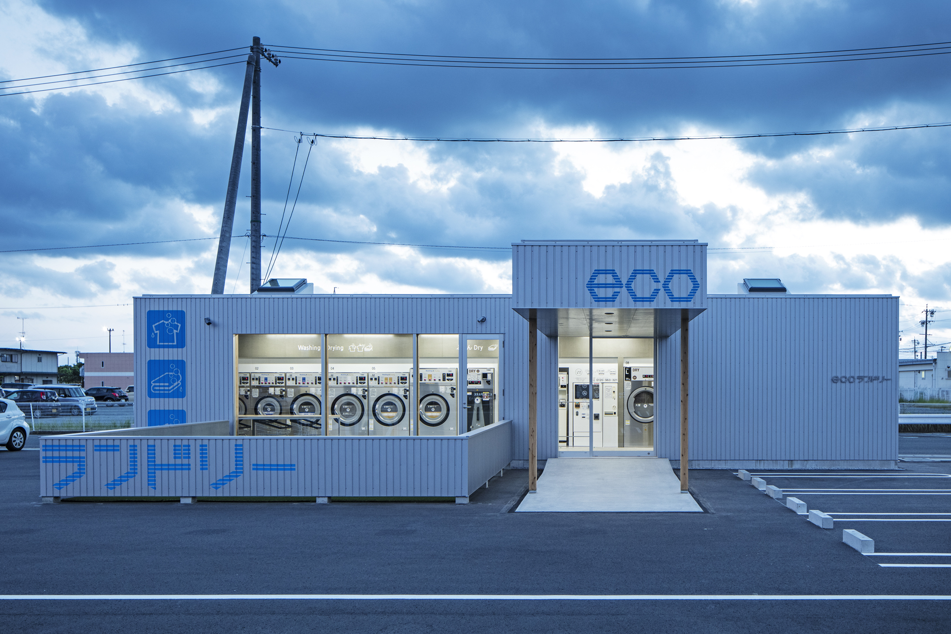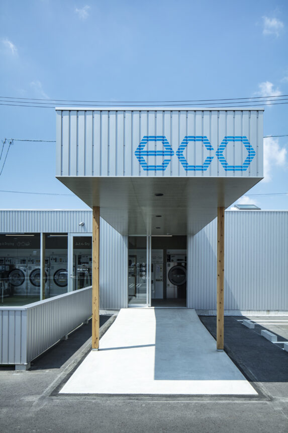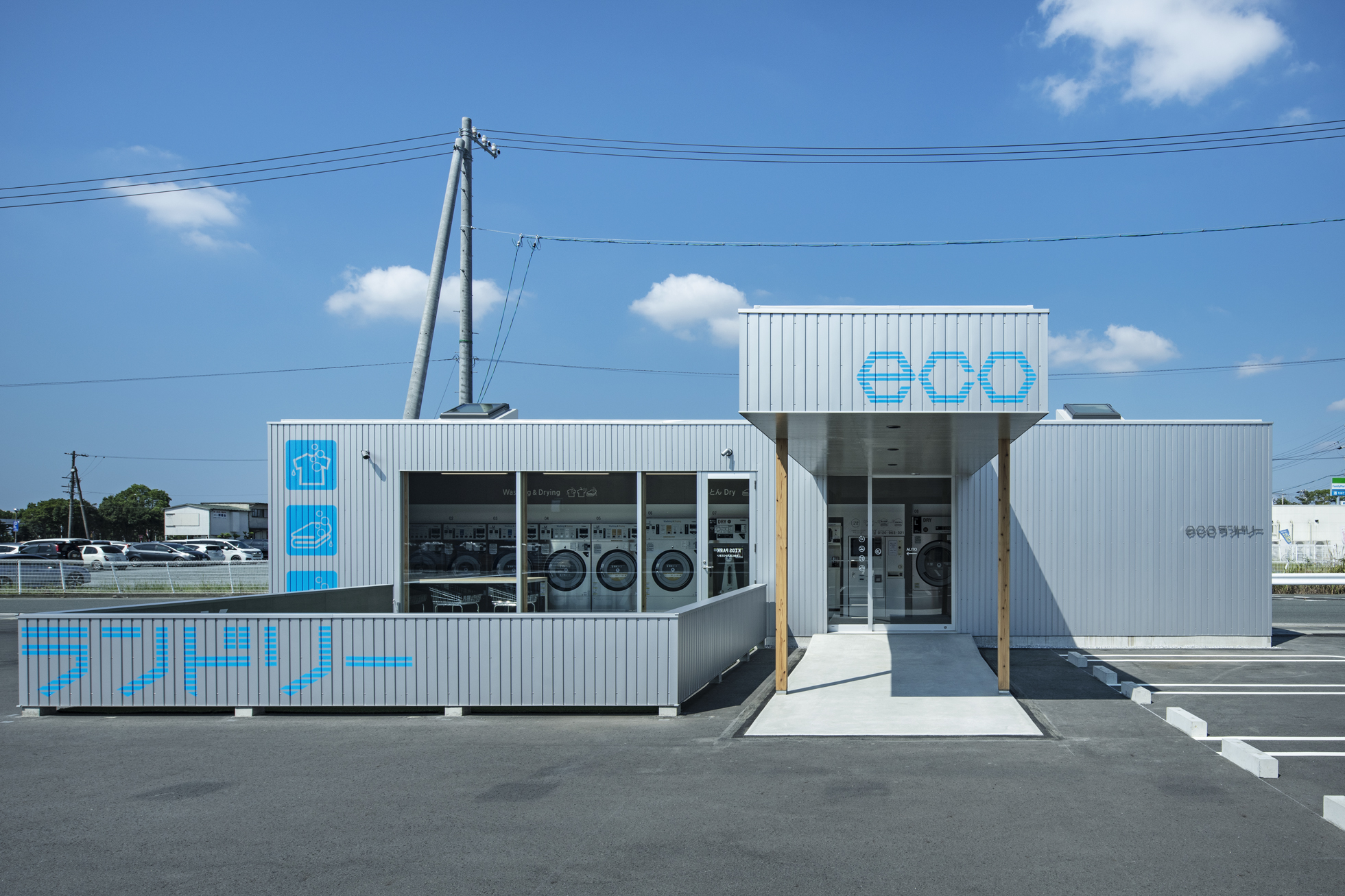 ecoランドリー 市野店 所在地静岡県浜松市 発注者第一商事株式会社 業務内容基本設計・実施設計・工事監理 用途店舗 竣工年月2020.08 構造形式木造 規模平屋建て 延床面積67.98㎡ 撮影長谷川健太 担当岩田貴昭