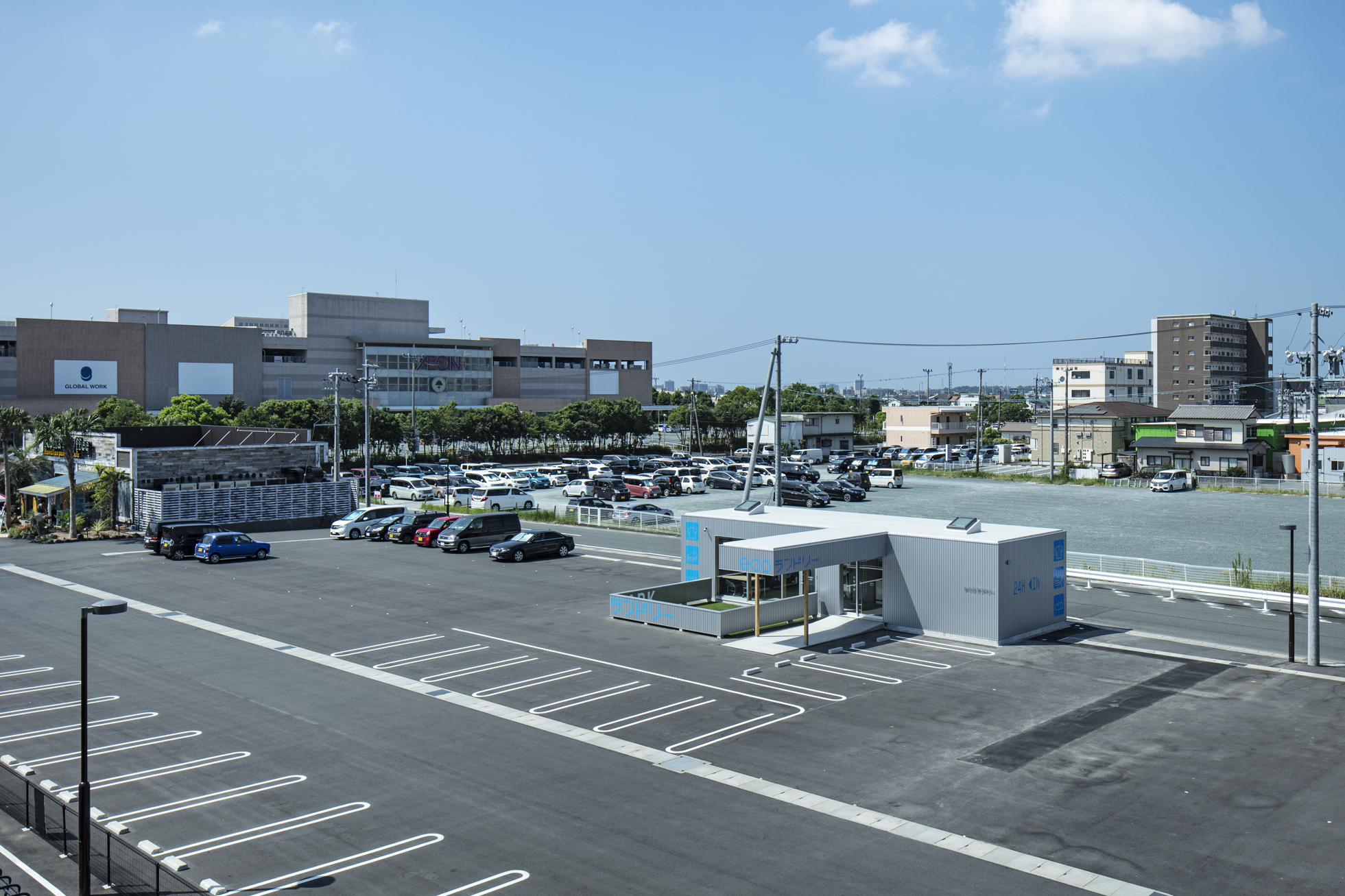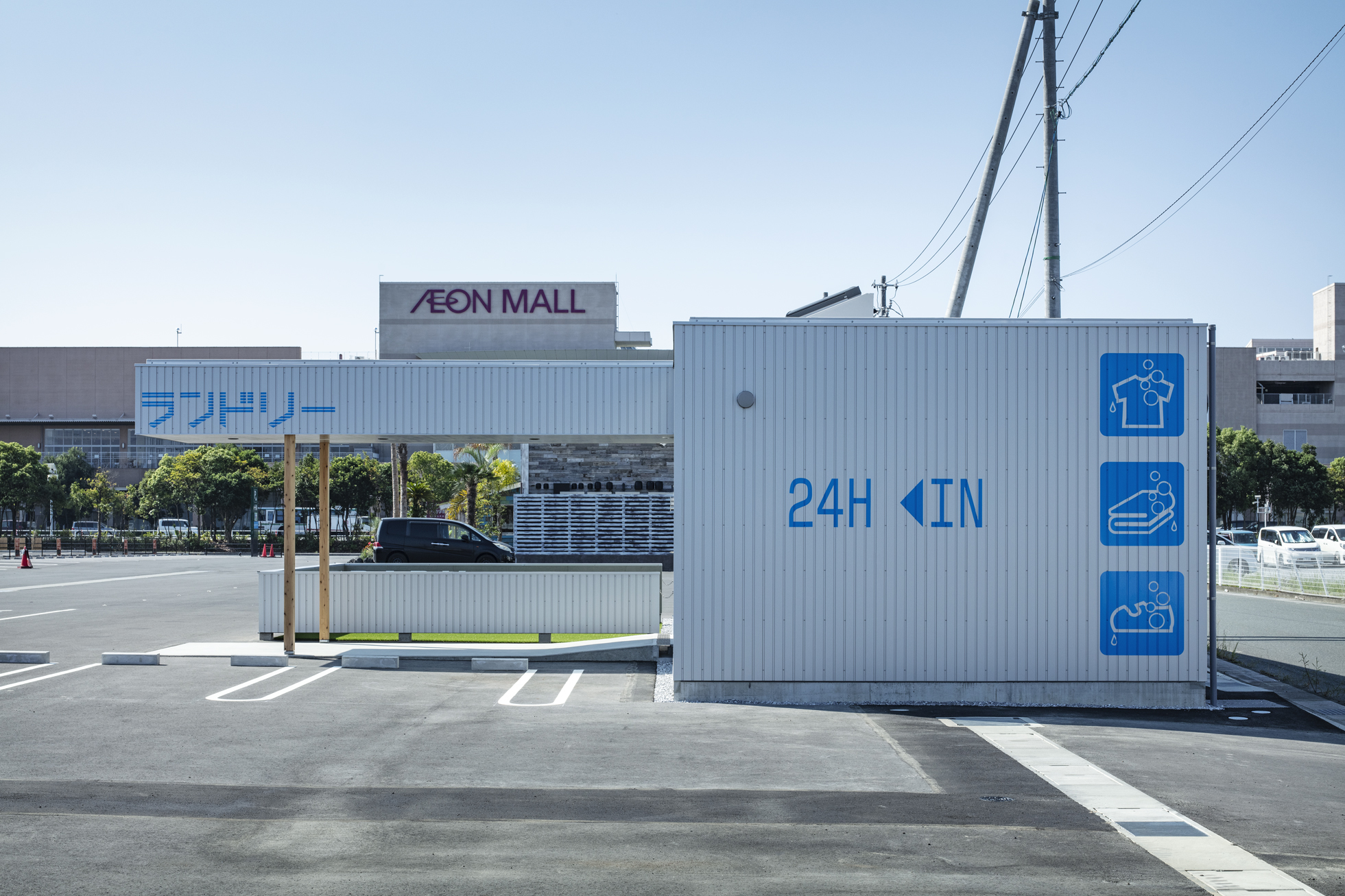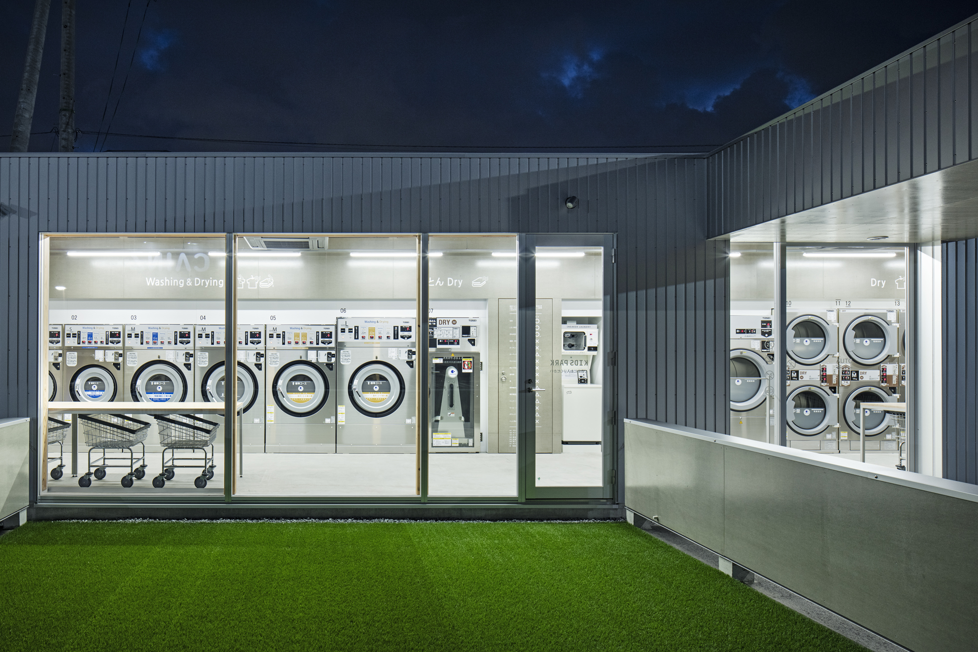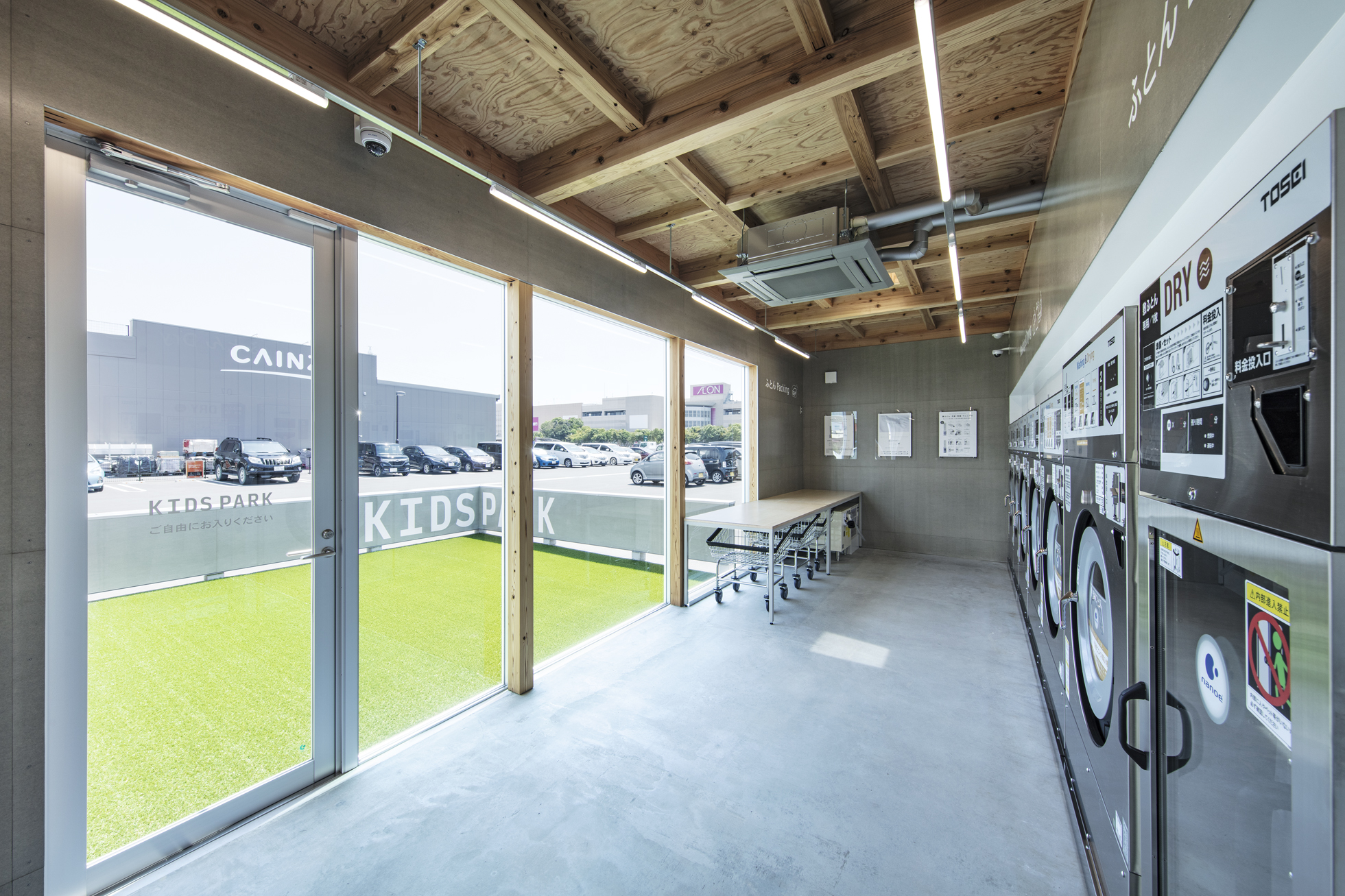 ecoランドリー 市野店 所在地静岡県浜松市 発注者第一商事株式会社 業務内容基本設計・実施設計・工事監理 用途店舗 竣工年月2020.08 構造形式木造 規模平屋建て 延床面積67.98㎡ 撮影長谷川健太 担当岩田貴昭