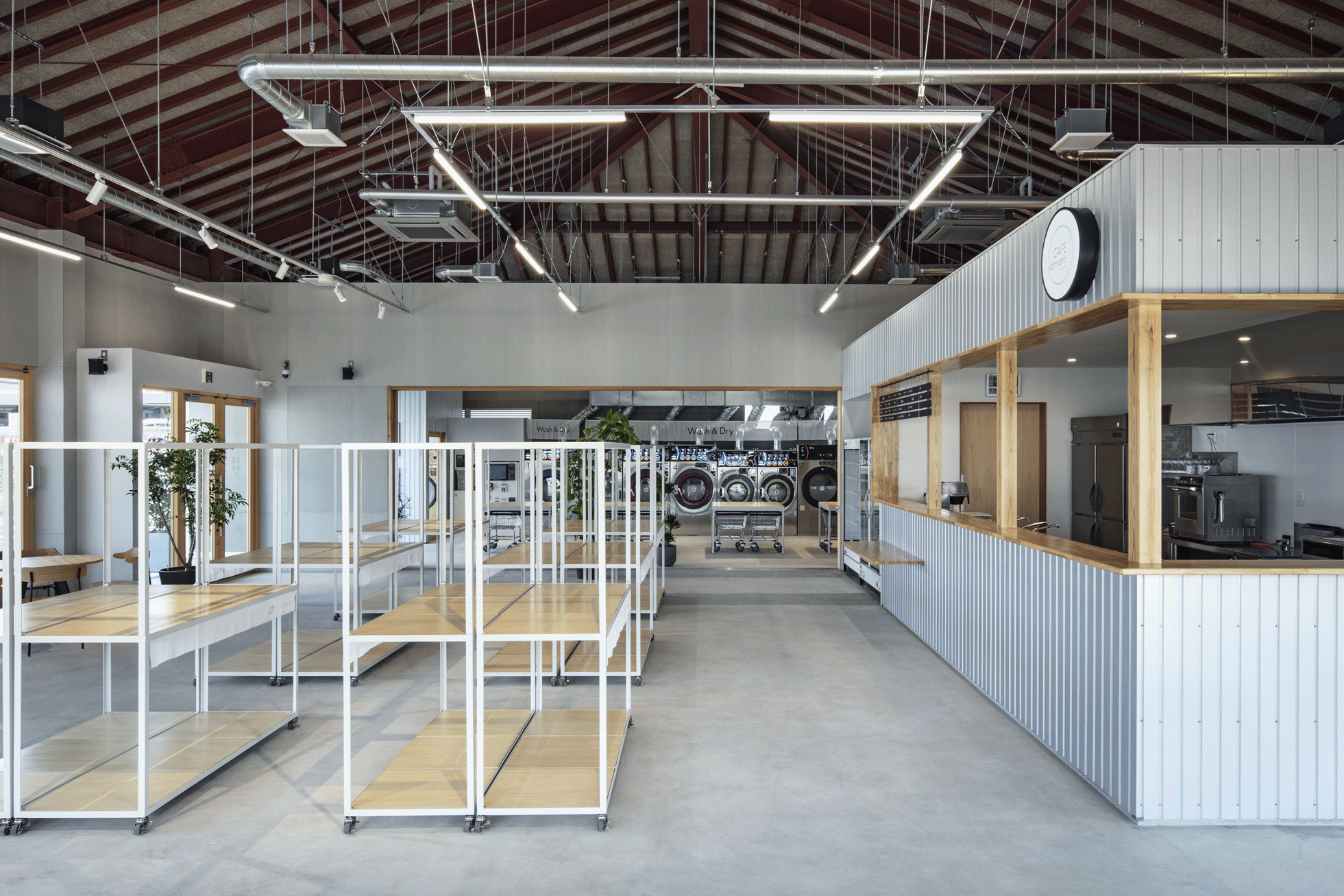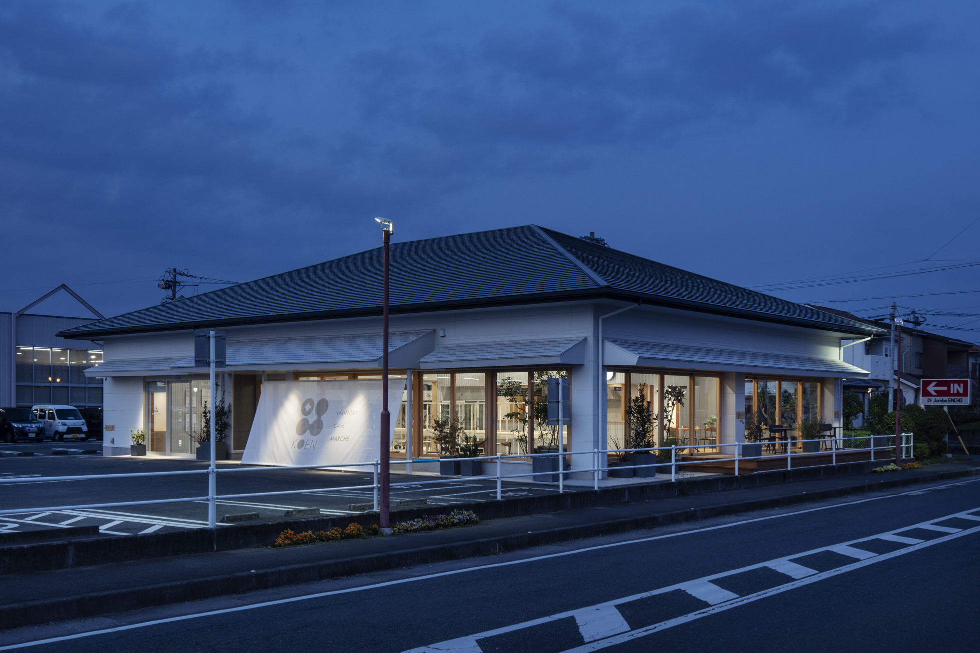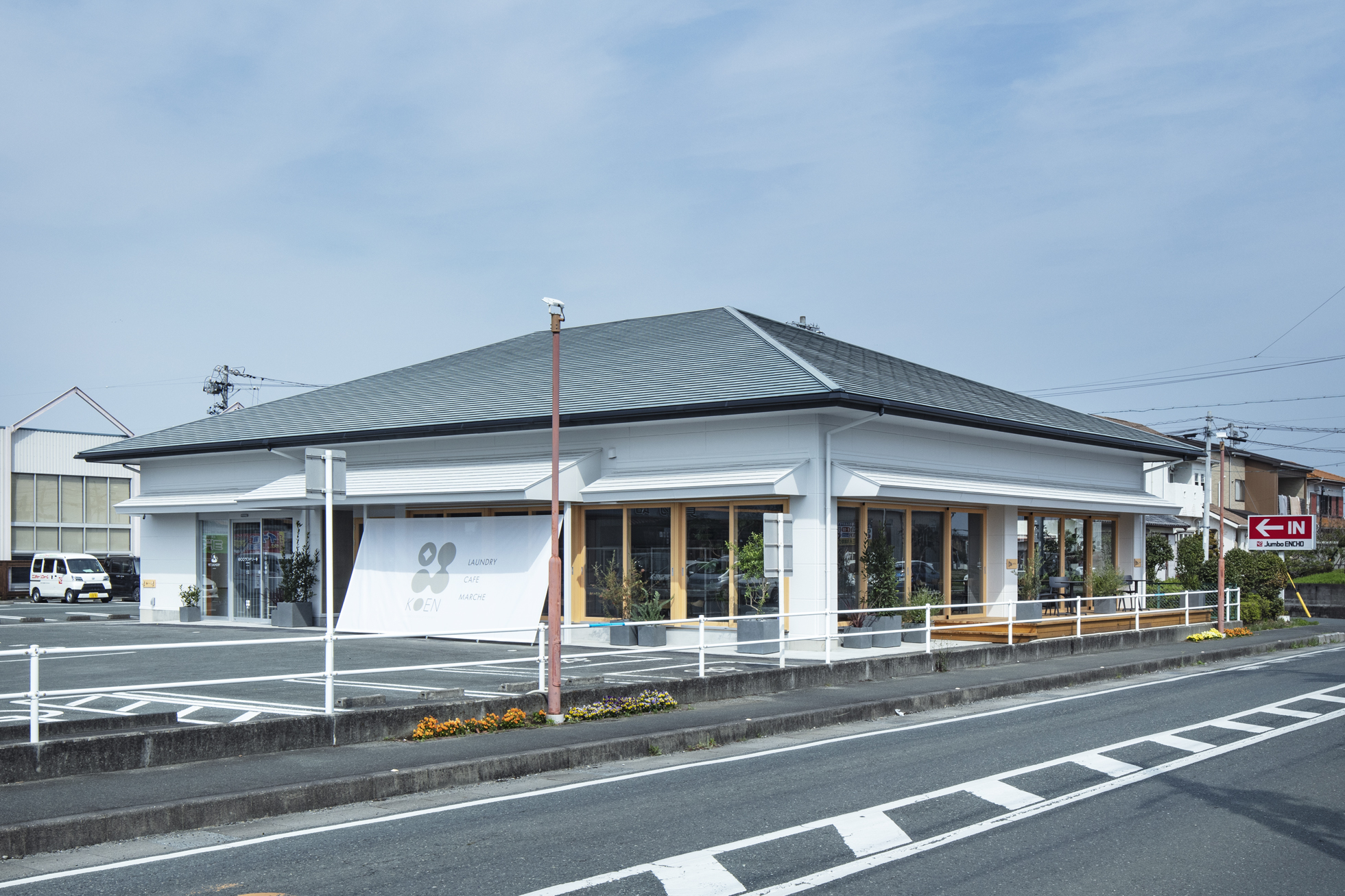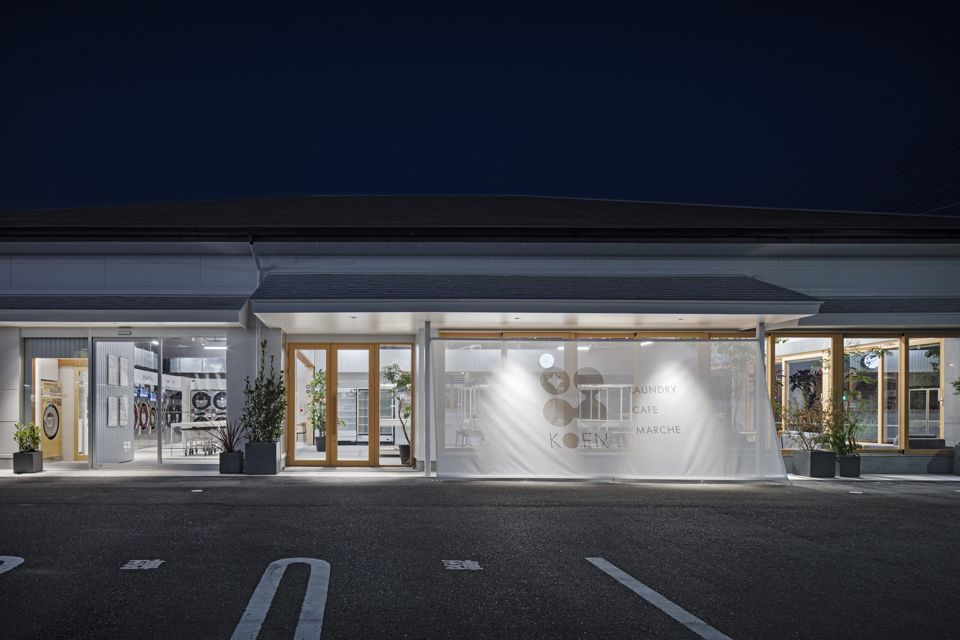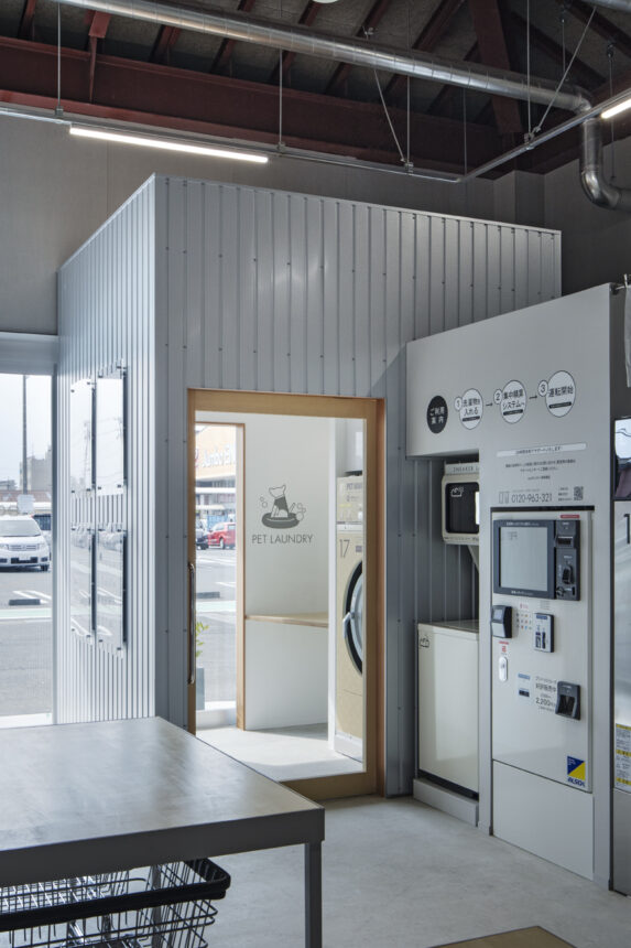 KOEN/ecoランドリー+ 西貝塚店 所在地静岡県磐田市 発注者第一商事株式会社 業務内容基本設計・実施設計・工事監理 用途店舗 竣工年月2022.04 構造形式鉄骨造 規模平屋建て 延床面積299.24㎡ 設計協力サイン計画:株式会社テクイジデザイン 撮影長谷川健太 担当岩田貴昭